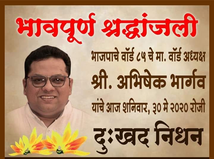 Abhishek Bhargav, a karkarta of Bharatiya Janata Party Vile Parle , who was very friendly, passed away  on 30th May ,2020. He expired due to a heart attack.