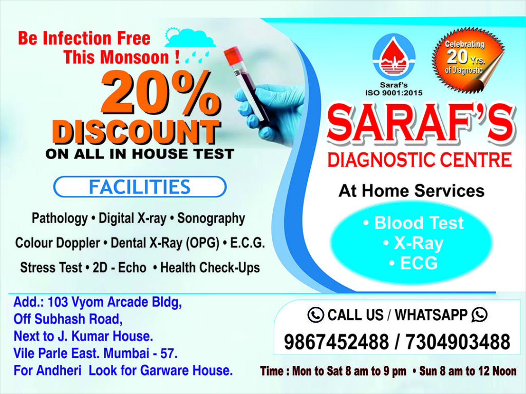Vile Parle, Mumbai – In a bid to promote health and wellness during the monsoon season, Saraf’s Diagnostic Centre, a renowned name in the diagnostic industry, is offering an exclusive 20% discount on all in-house test facilities. The discount covers a wide range of services, including Pathology, Digital X-ray, Sonography, Colour Doppler, Dental X-Ray (OPG), E.C.G., Stress Test, 2D-Echo, and Health Check-Ups.