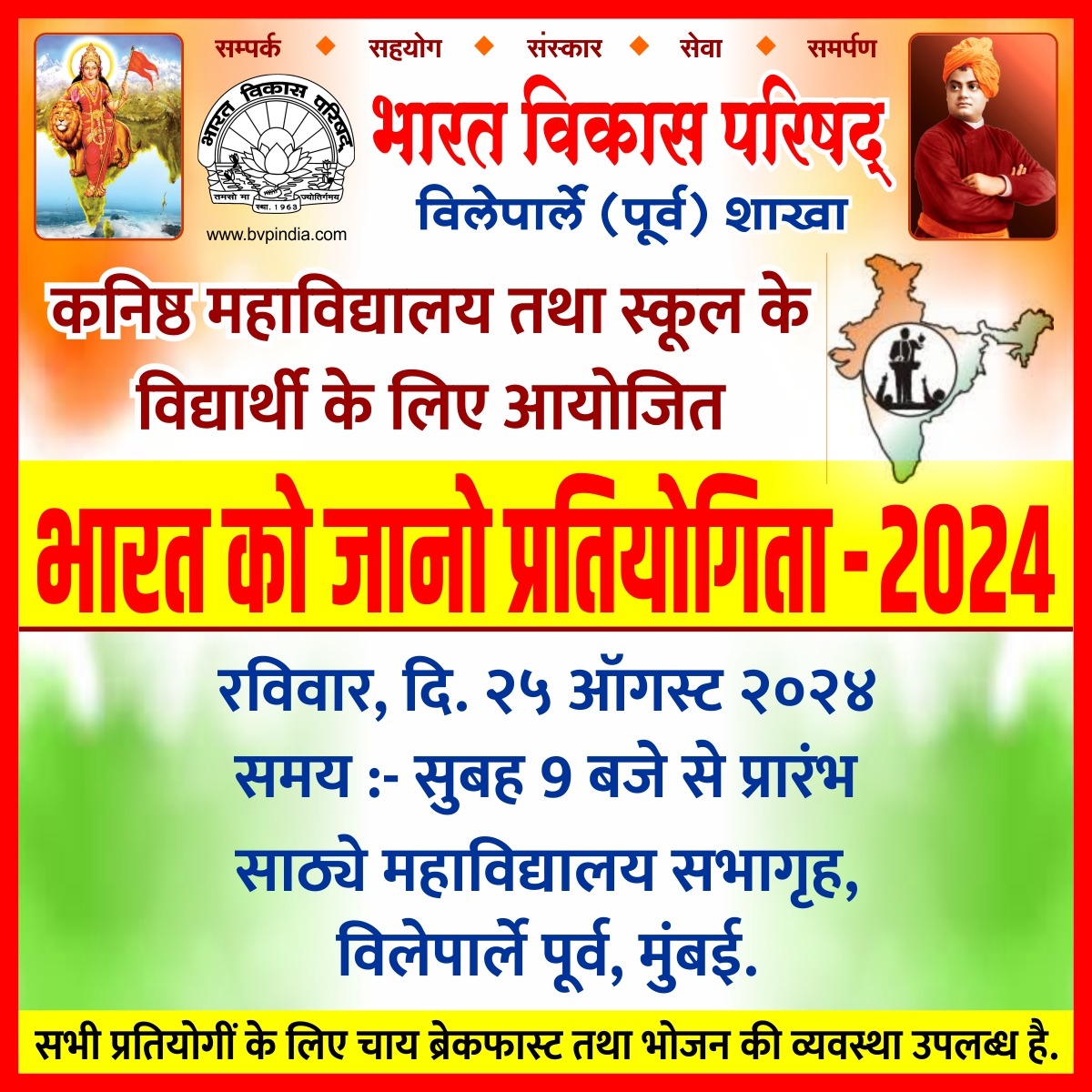 The competition will commence at 9:00 AM at the Sathaye College Auditorium, Vile Parle (East), Mumbai. The event is a part of Bharat Vikas Parishad’s ongoing efforts to instill values of patriotism and cultural awareness among the younger generation.