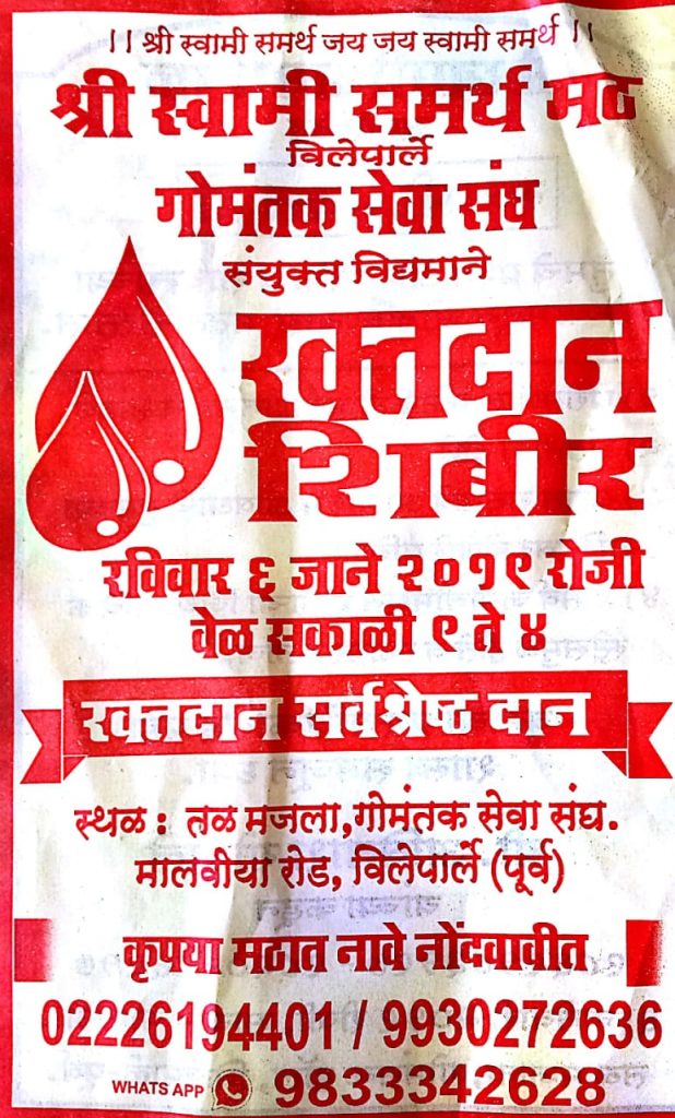 स्वामी समर्थ मठ विलेपार्ले आणि गोमांतक सेवा संघ यांच्या संयुक्त विद्यमाने सहा जानेवारी २०१९ रोजी रक्तदान शिबीर आयोजित करण्यात आले आहे .वेळ सकाळी ९ ते ४ आणि स्थळ गोमांतक सेवा संघ तळ मजला कृपया आपली नावे मठात नोंदवावी.