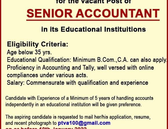 Read moreParle Tilak Vidyalaya Association invites applications for the vacant post of Senior Accountant PARLE TILAK VIDYALAYA ASSOCIATION Invites Applications for