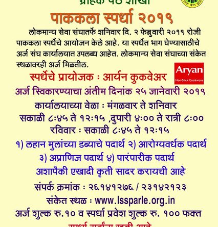 Read moreलोकमान्य सेवा संघ यांच्यातर्फे शनिवार दि. ०२ फेब्रुवारी २०१९ रोजी पाककला स्पर्धा आयोजित केली आहे.पाककला स्पर्धेत भाग घ्यायचा असेल तर प्रवेश अर्ज
