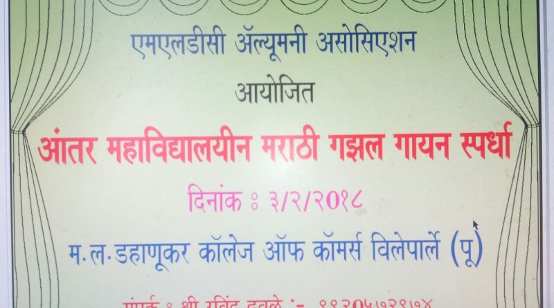 Read moreएम एल डी सी अलुम्नी असोसिएशनतर्फे मुंबई विश्व विद्यालयाशी संलग्न महाविद्यालयांतील विद्यार्थ्यांसाठी प्रथमच मराठी गझल गायन स्पर्धेचे आयोजन करण्यात येत