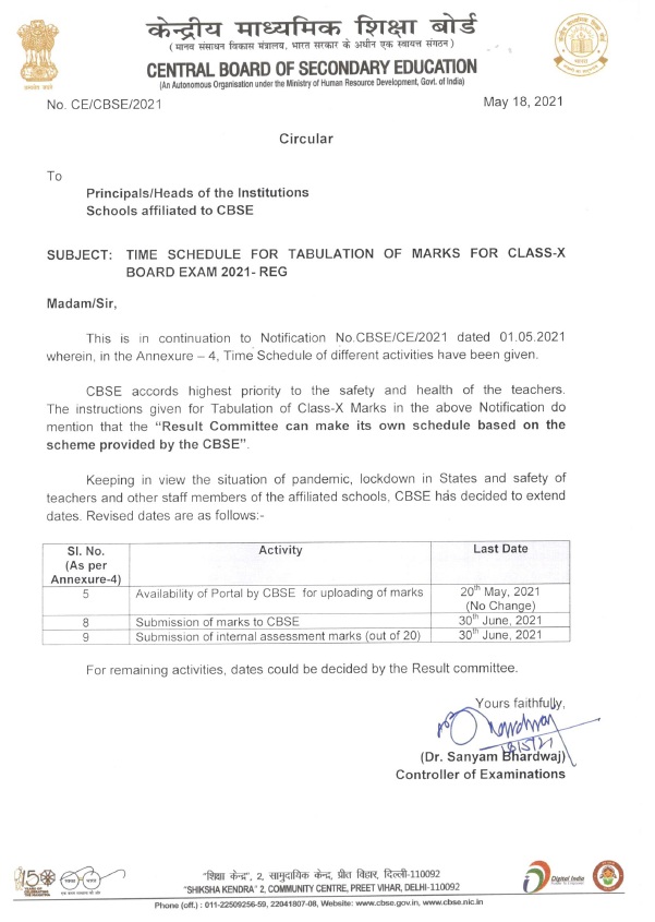 This is in continuation to notification no CBSE/CE/2021 dated 01.05.2021 where in, in the Annexure -4, Time schedule of different activities have been given. CBSE accords to the safety and health of teachers. The instructions given for the tabulation of Class-X marks in the above notification do mention that the “Result Committee can make its own schedule based on the scheme provided by the CBSE”