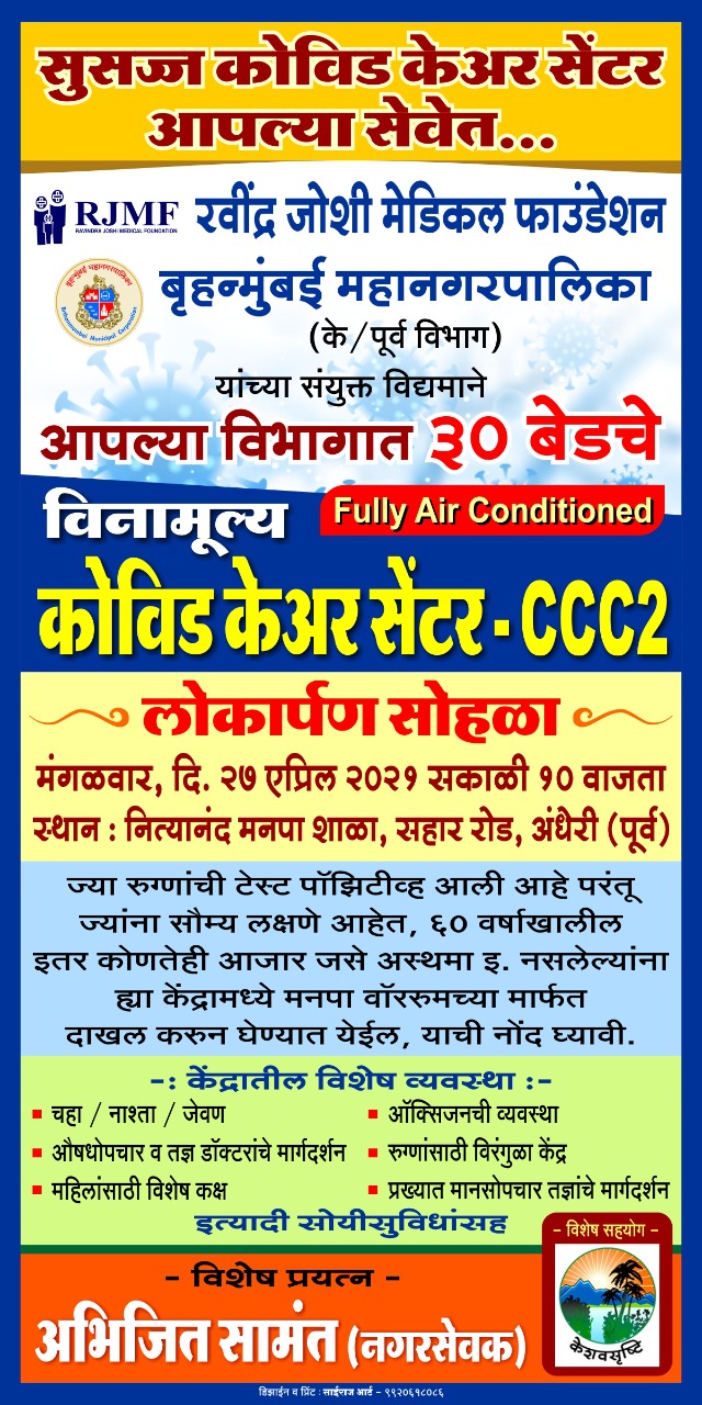 On Tuesday, 22nd April 2021 with efforts of Ravindra Joshi Medical foundation, Abhijeet Samant (Corporator) and Brihanmumbai Mahanagar palika (K-East) a dedicated 30 Beds covid care centre will be available for covid positive parlekars. The covid centre will be inaugrated on Tuesday, 27th April at 10 am. The covid care centre is at Nityanand Mahanagar palika school, Sahar Road, Opposite Bahar Cinema or HSBC Bank. The centre is fully air conditioned.