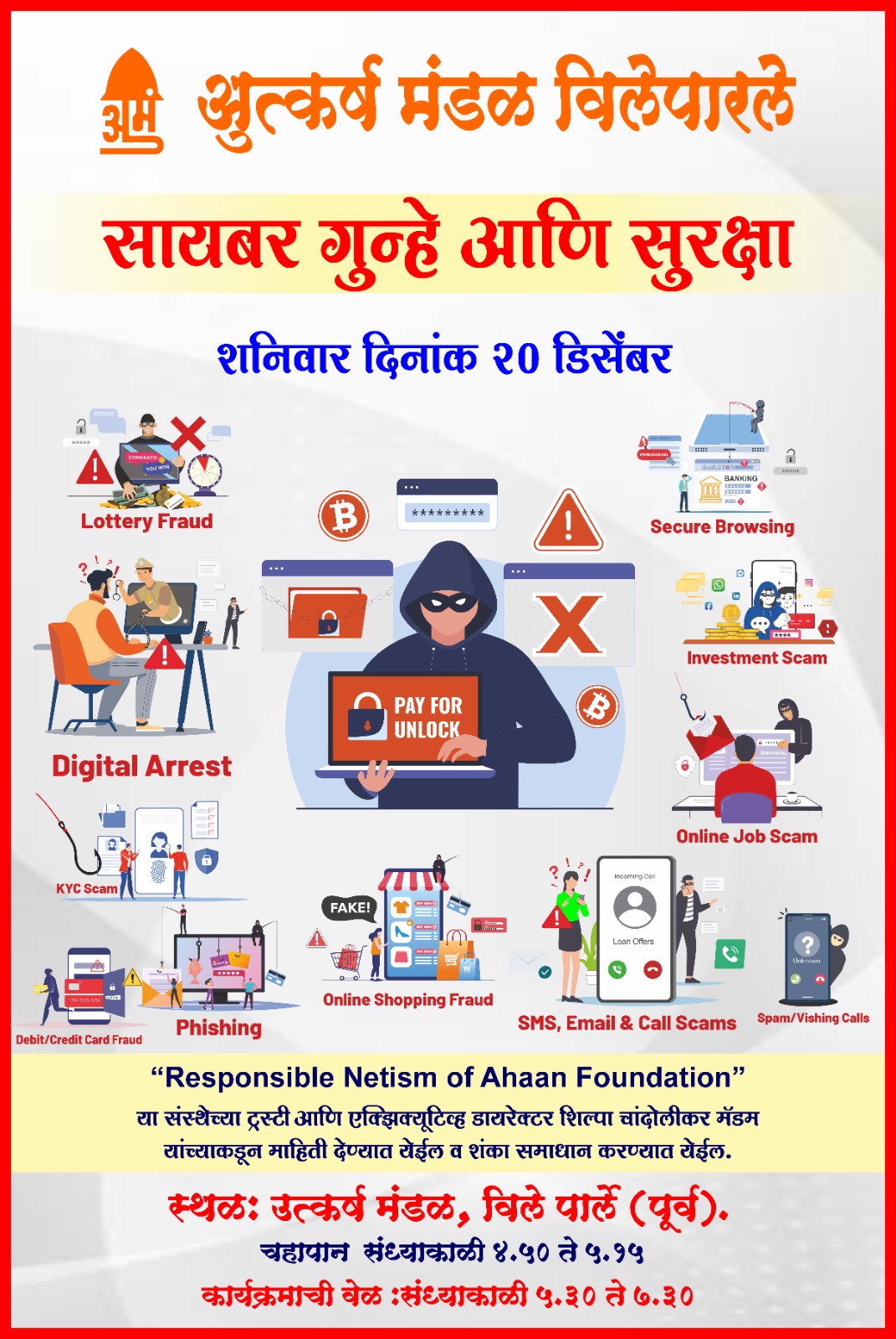 With the rise in cyber crimes and online frauds, a Cyber Crime and Digital Safety Awareness Program has been organized at Utkarsh Mandal, Vile Parle on Saturday, 20 December.