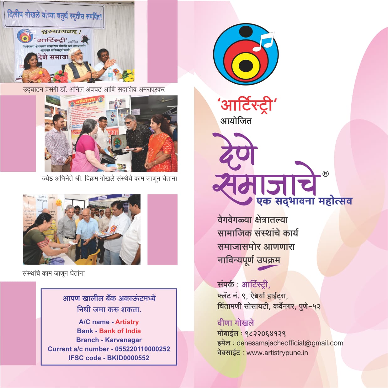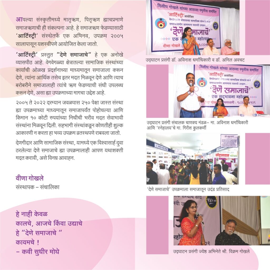 “आर्टिस्ट्री” प्रस्तुत “देणे समाजाचे ” हे एक अनोखे व्यासपीठ आहे. वेगवेगळ्या क्षेत्रातल्या सामाजिक संस्थांच्या कार्याची ओळख प्रदर्शनाच्या माध्यमातून समाजाला करून देणे , त्यांना आर्थिक तसेच इतर मदत मिळवून देणे आणि त्याच बरोबरीने समाजालाही त्यांचे ऋण फेडण्याची संधी उपलब्ध करून देणे , असा ह्या उपक्रमाच्या मागचा उद्देश आहे. २००५ ते २०२२ ह्या कालावधीत जवळपास २५० सामाजिक संस्था ह्या उपक्रमाच्या माध्यमातून समाजापर्यंत पोहोचल्या आणि अंदाजे दहा कोटीपेक्षा जास्त निधीची भरीव मदत सेवाभावी संस्थांना मिळवून दिली. सहभागी संस्थांकडून कोणतीही शुल्क आकारणी न करता हा भव्य उपक्रम गेली १८ वर्षे पुण्यामध्ये व्रतस्थपणे राबवला जातो.