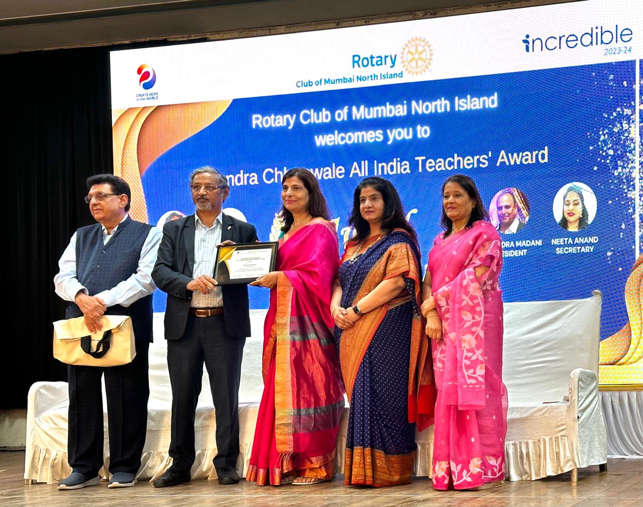 The Rajendra Chhapwale All India Award, established by the Rotary Club of Mumbai North Island to acknowledge ‘Nation Builders in Education,’ has been awarded to Dr. (Mrs.) Arnavaz Bhagat, Principal of Parle Tilak Vidyalaya (ICSE). Rotary and the community proudly recognize her as a ‘Social Impact Visionary Leader.’ This esteemed award was presented to her during a ceremony held at Vidyanidhi School, Juhu, on April 13, 2024