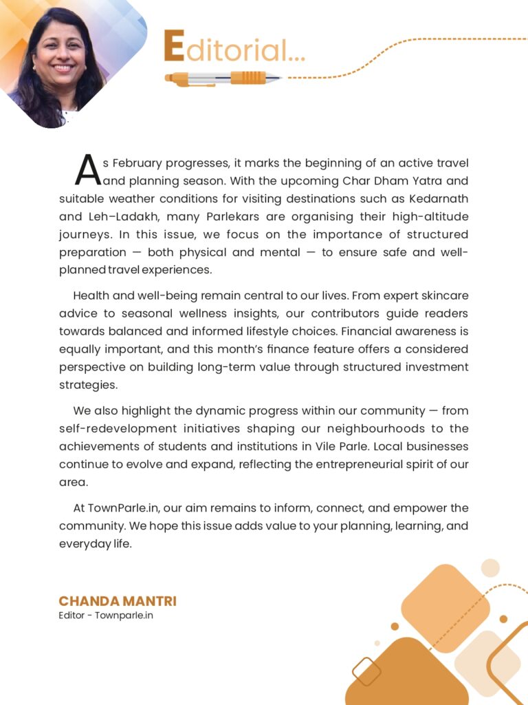 As February progresses, it marks the beginning of an active travel and planning season. With the upcoming Char Dham Yatra and suitable weather conditions for visiting destinations such as Kedarnath and Leh–Ladakh, many Parlekars are organising their high-altitude journeys. In this issue, we focus on the importance of structured preparation — both physical and mental — to ensure safe and well-planned travel experiences.