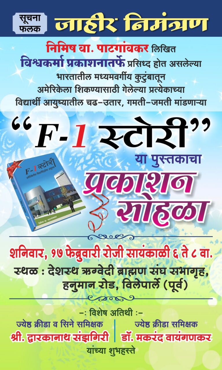 श्री निमिष पाटगांवकर  यांच्या  “F1- स्टोरी”या विश्वकर्मा प्रकाशनातर्फे प्रसिद्ध होत असलेल्या पुस्तकाचे प्रकाशन शनिवार दि 17फेब्रुवारी 2018 रोजी ज्येष्ठ क्रिडा समिक्षक श्री. द्वारकानाथ संझगिरी आणि श्री. मकरंद वायंगणकर यांच्या हस्ते होत आहे. या प्रकाशन सोहळ्याचे आपल्याला अगत्याचे निमंत्रण देत आहे.