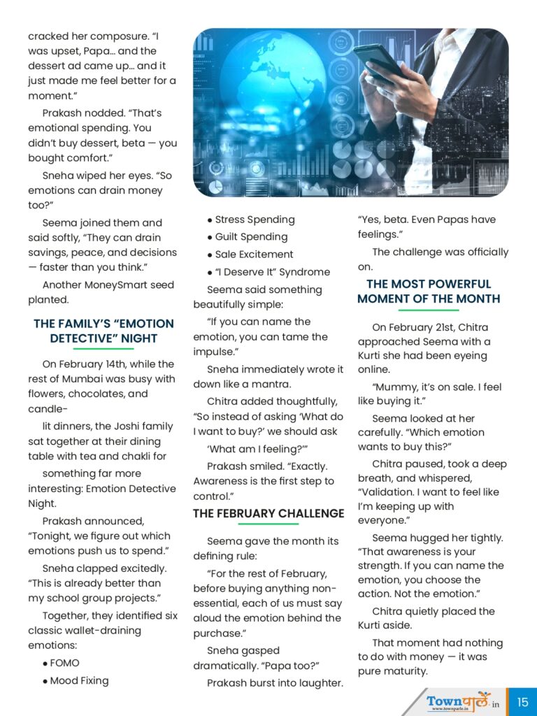 Chitra, now twenty-one, was quietly struggling with the invisible pressures of adulthood — friendships, job applications, comparison to peers, and the universal fear of “falling behind in life.” Sneha, sixteen, rode the emotional roller coaster of teenagerhood, where feelings came fast, strong, and often expensive. Prakash and Seema watched closely, knowing something the girls didn’t: emotions affect spending more than logic ever will.