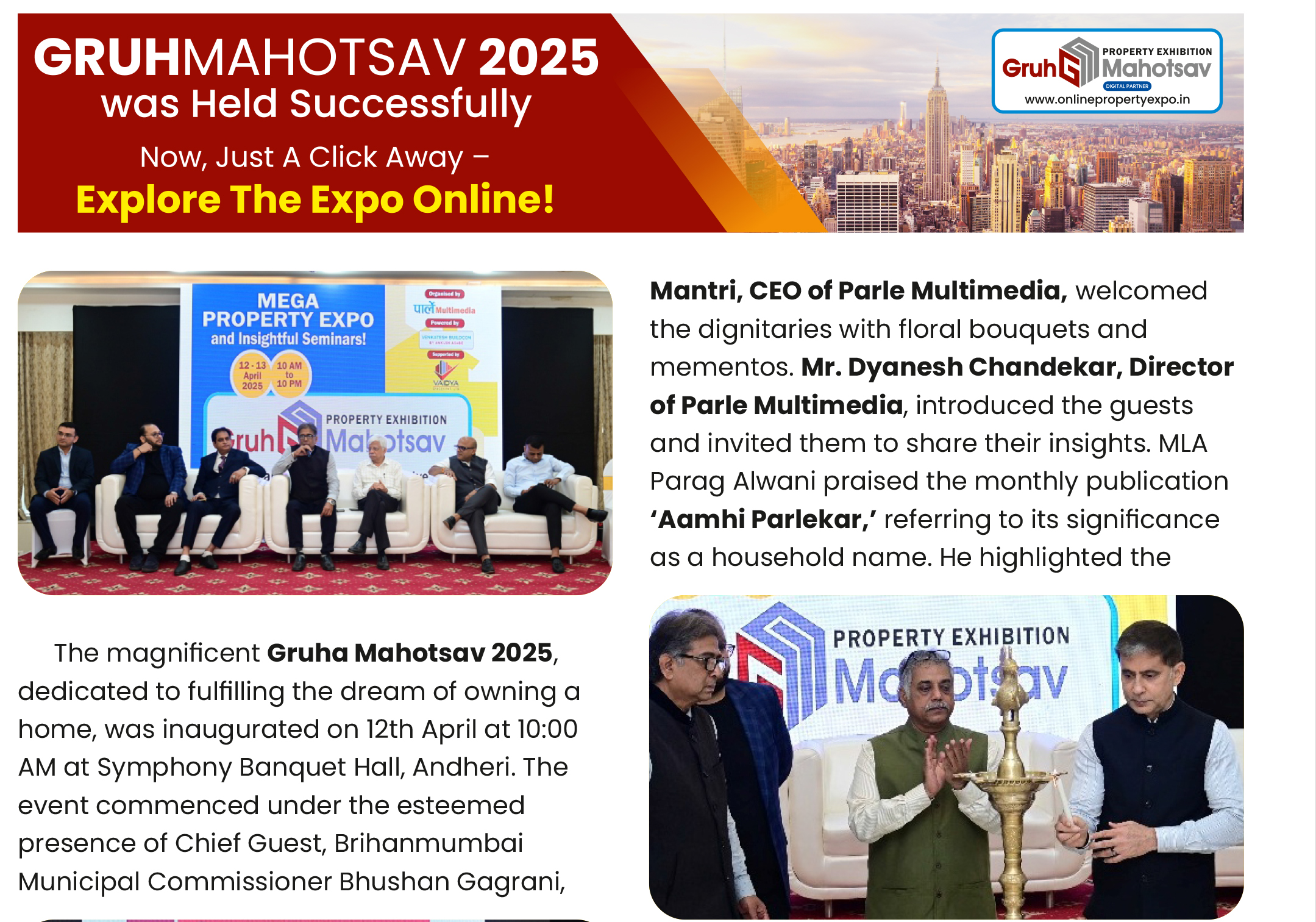 The inaugural ceremony began with a traditional lamp-lighting led by Commissioner Bhushan Gagrani, followed by an engaging stage program. Ms. Chanda Mantri, CEO of Parle Multimedia, welcomed the dignitaries with floral bouquets and mementos. Mr. Dyanesh Chandekar, Director of Parle Multimedia, introduced the guests and invited them to share their insights. MLA Parag Alwani praised the monthly publication “Aamhi Parlekar,” referring to its significance as a household name. He highlighted the growth of Mumbai’s suburbs, particularly Parle, which has been shaped by visionary developers like Baburao Paranjpe, and requested measures to address disparity in government treatment between South Mumbai and suburban areas.