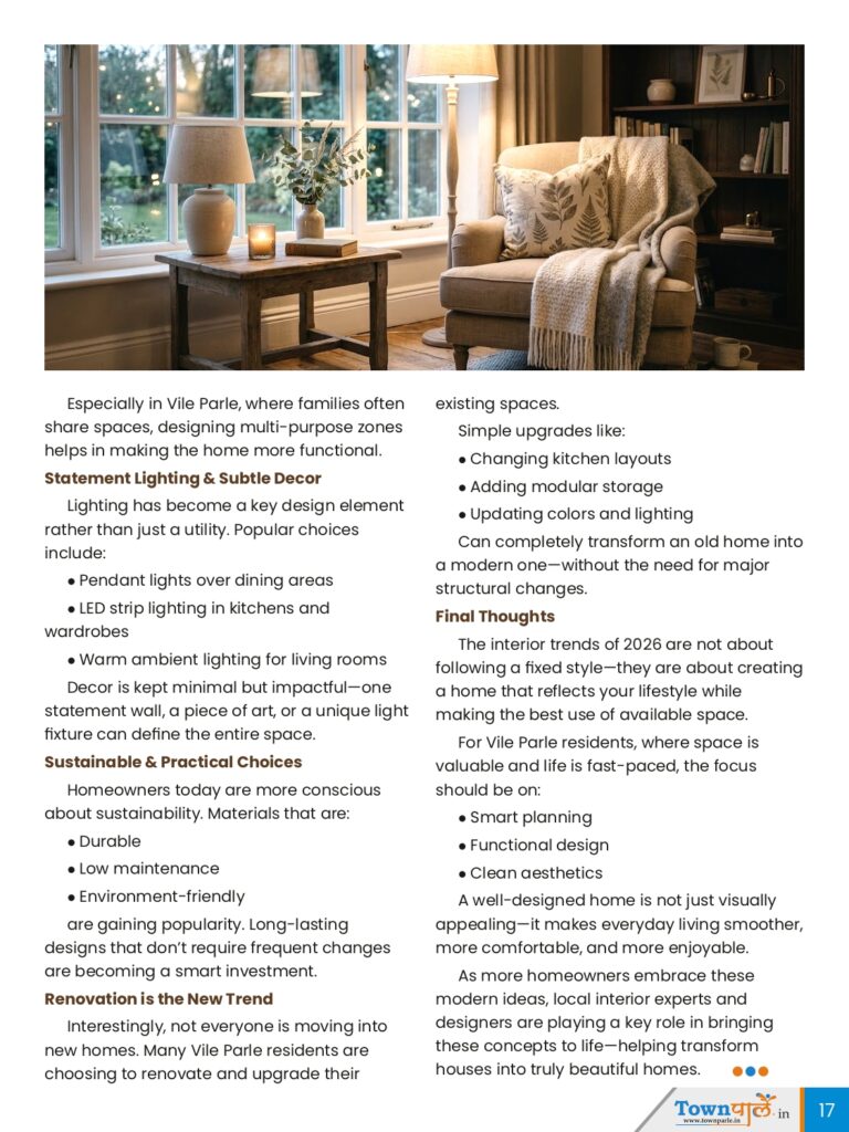 As Vile Parle continues to evolve with new developments, redeveloped buildings, and modern apartments, homeowners are increasingly looking for interiors that are not just beautiful—but also practical, efficient, and future-ready. In 2026, interior design is all about smart use of space, clean aesthetics, and personalized living. Whether you are moving into a new flat or renovating your existing home, here are the latest trends that can help you transform your space into a modern, functional haven.