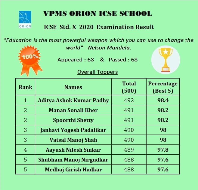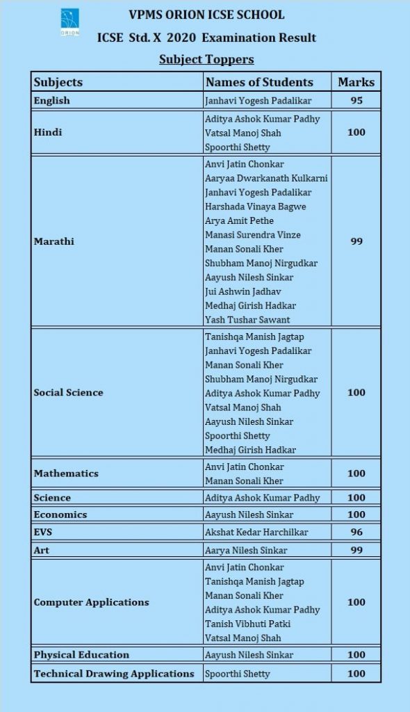 Vile Parle Mahila Sangh Orion ICSE School Topper-