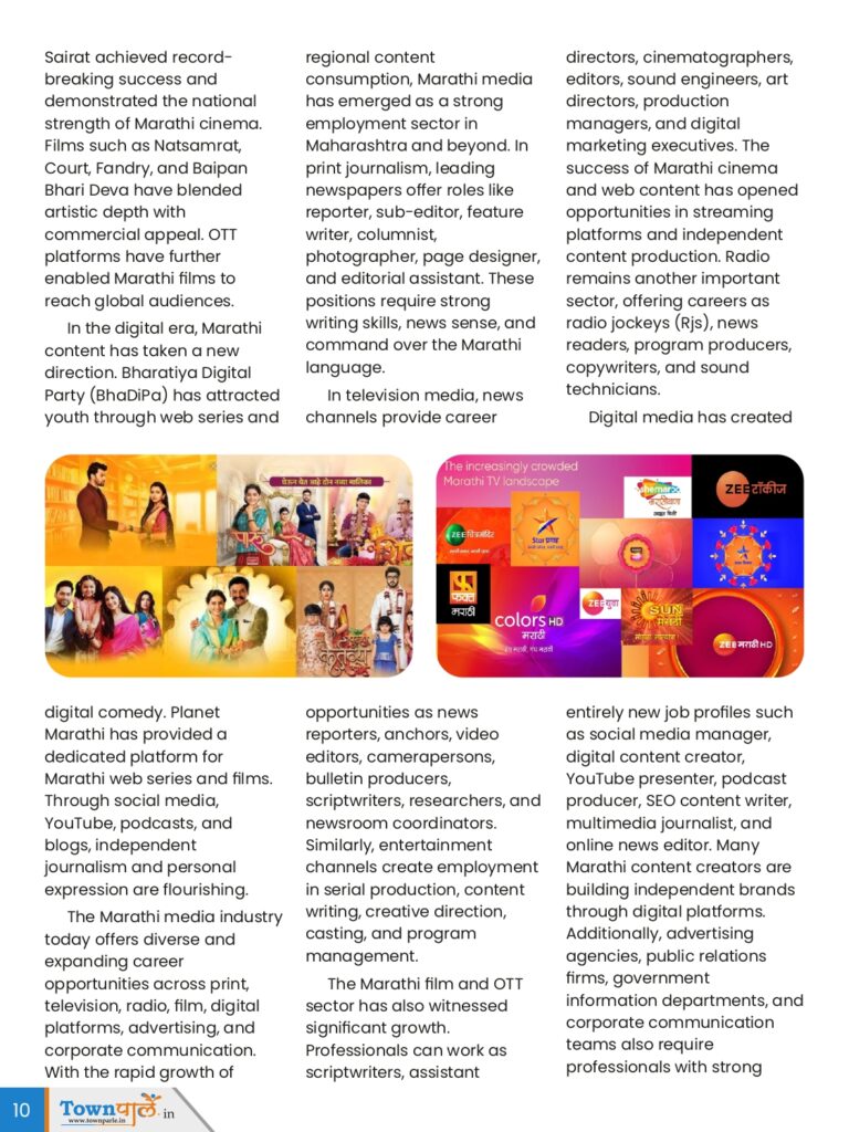 The Marathi media industry today offers diverse and expanding career opportunities across print, television, radio, film, digital platforms, advertising, and corporate communication. With the rapid growth of regional content consumption, Marathi media has emerged as a strong employment sector in Maharashtra and beyond. In print journalism, leading newspapers offer roles like reporter, sub-editor, feature writer, columnist, photographer, page designer, and editorial assistant. These positions require strong writing skills, news sense, and command over the Marathi language.