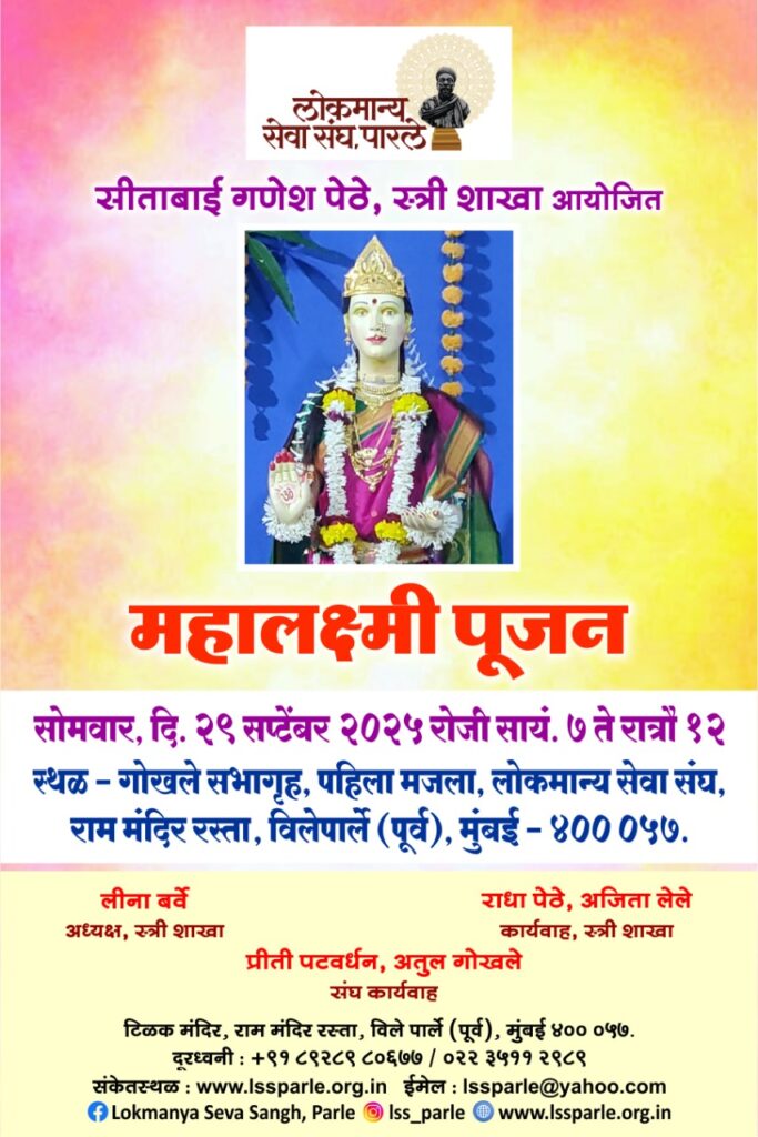Lokmanya Seva Sangh, Stree Shakha, will host the traditional Mahalaxmi Pujan on Monday, 29th September 2025. The event will take place from 7 PM to midnight at Gokhale Sabhagruh, 1st Floor, Lokmanya Seva Sangh, Ram Mandir Road, Vile Parle (East), Mumbai. Devotees and families are invited to join the celebrations and seek the blessings of Goddess Mahalaxmi.
