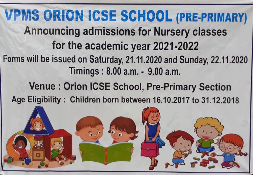 The Admission forms for new admission for VPMS Orion School (Pre-Primary) I.C.S.E. Curriculum for the year 2021-2022 will be issued on 21st November Saturday & 22nd November, Sunday between 8 am to 9 am. Children born between between 16.10.2017 to 31.12.2018 can apply.