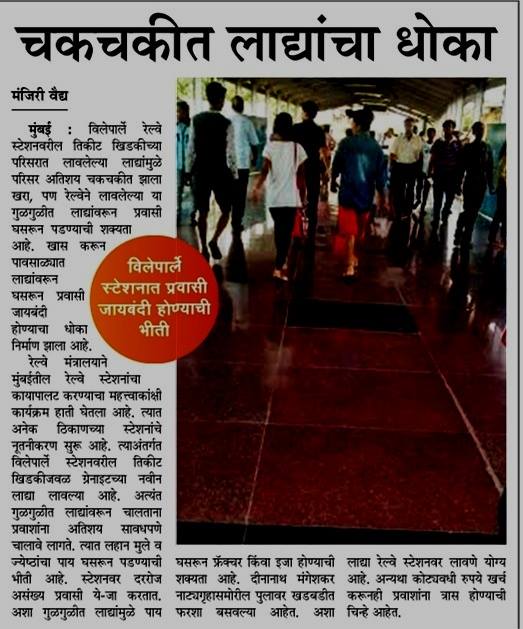 Railway minister Mr. Suresh Prabhu was in Vile Parle to inaugurate new pedestrian railway bridge in April 2016. This new bridge is provided with polished tiles, which are unsafe during monsoon season as anyone can slip on it.
