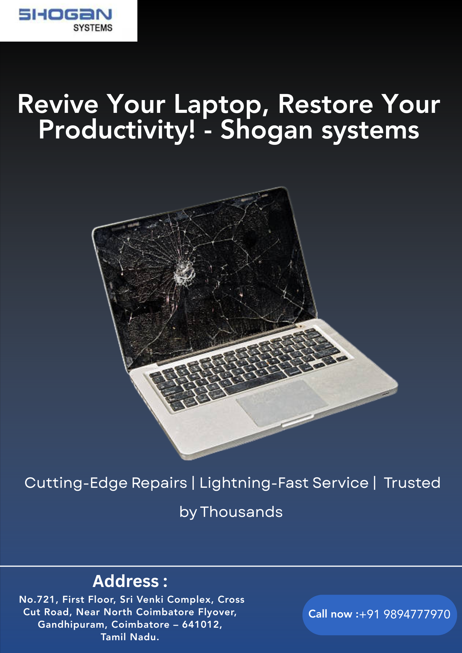 Shogan Systems is a top-rated laptop service center in Coimbatore, offering expert multi-brand laptop repair solutions with 23+ years of proven experience. Specializing in HP, Dell, Lenovo, Acer, Asus, Toshiba, Sony, Apple (MacBook), HCL, Samsung, and more, we handle everything from motherboard repairs and screen replacements to battery not charging issues, software problems, and overheating fixes. Whether you need a quick chip-level repair, OS installation, or data recovery, Our certified technicians use genuine components and follow brand-authorized practices. We use only OEM-certified spare parts to ensure long-lasting performance and brand compatibility. We provide both in-store and doorstep laptop repair services across Coimbatore.