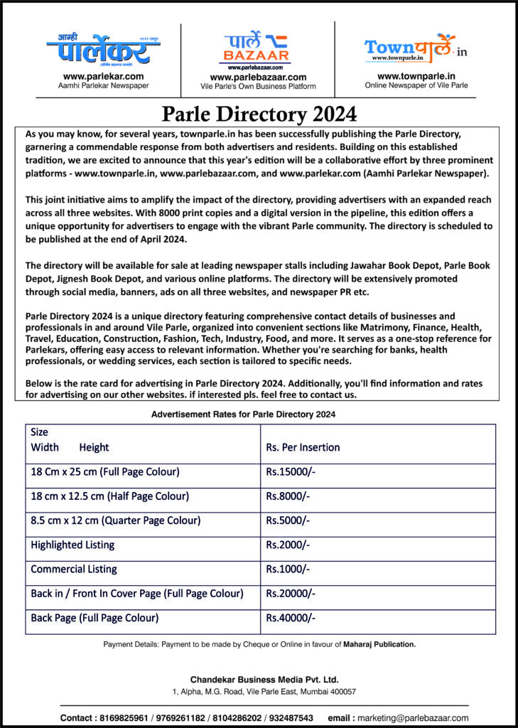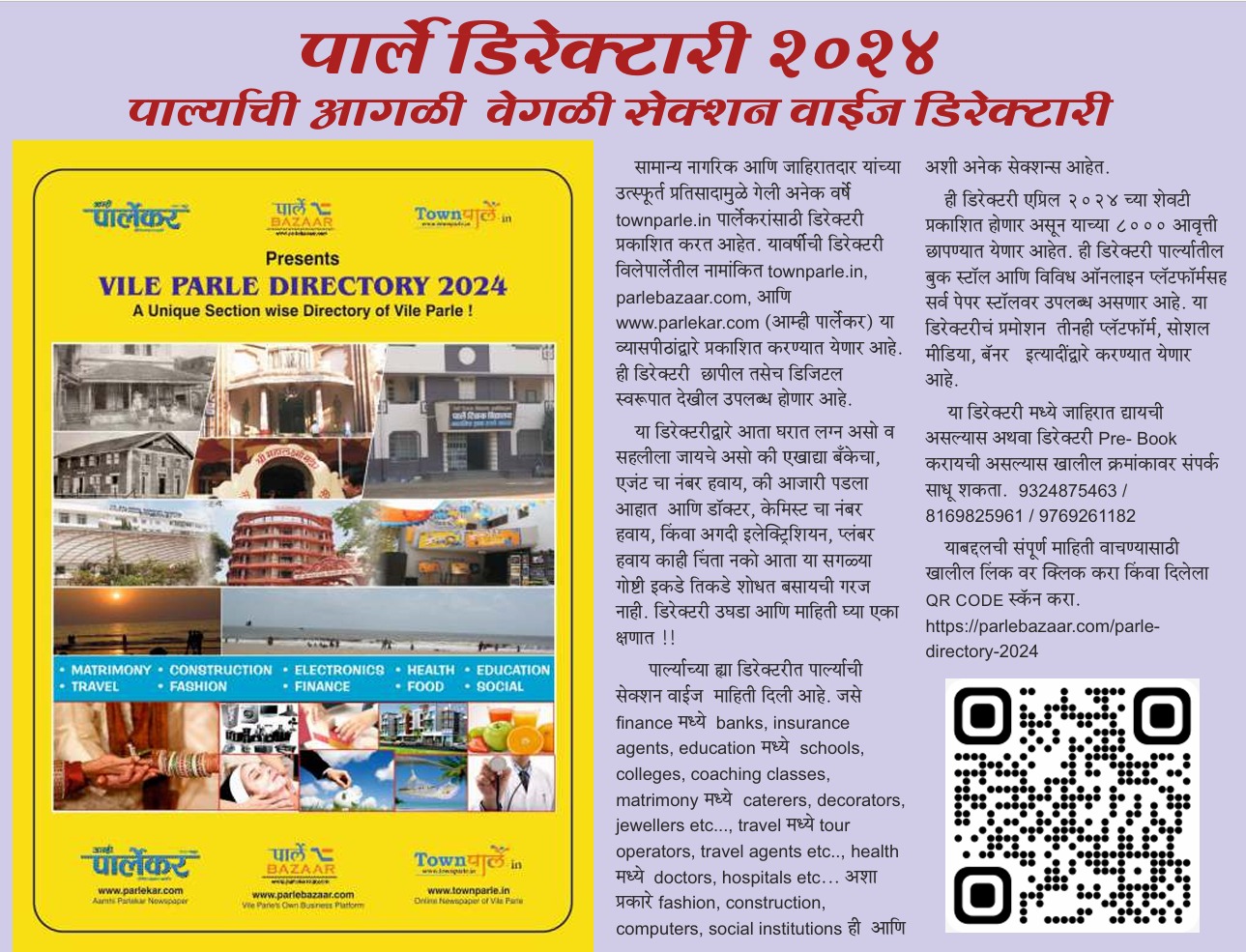 As you may know, for several years, townparle.in has been successfully publishing the Parle Directory, garnering a commendable response from both advertisers and residents. Building on this established tradition, we are excited to announce that this year’s edition will be a collaborative effort by three prominent platforms –