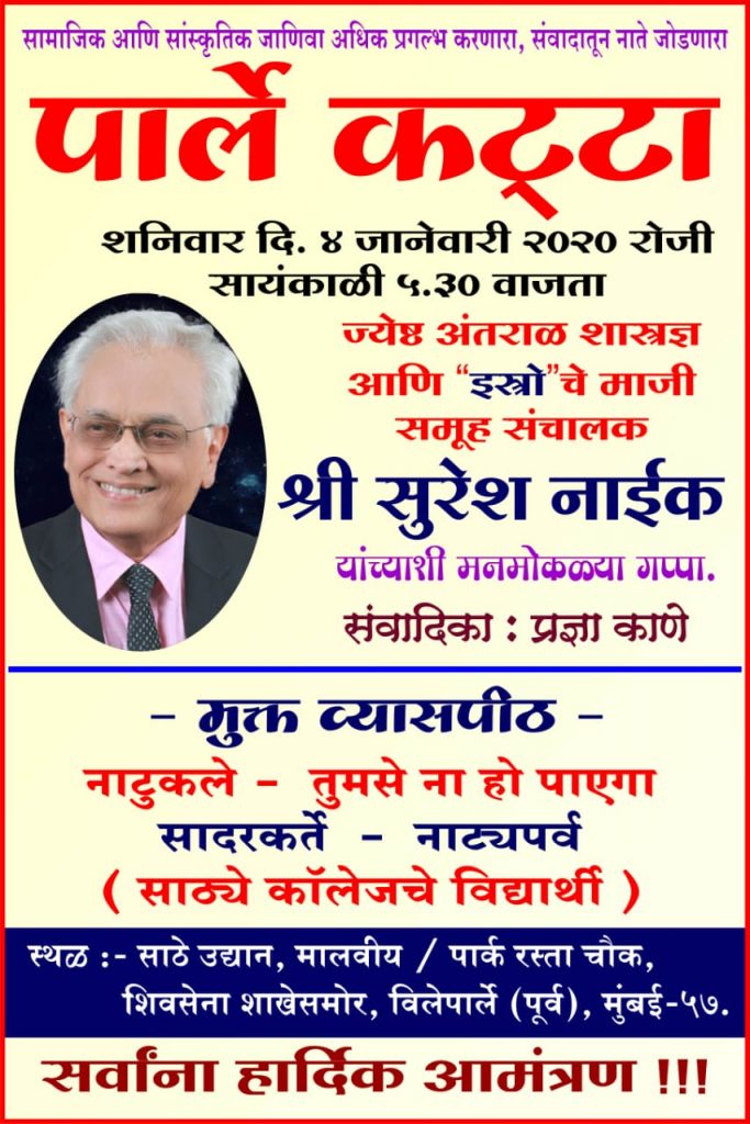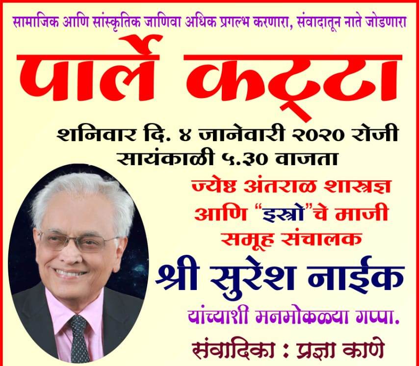 आपल्या मनातल्या अशा सगळ्या शंकाचे साध्या सोप्या पद्धतीने निरसन करण्यासाठी ज्येष्ठ अंतराळ शास्त्रज्ञ आणि ‘इस्रो’चे माजी समूह संचालक श्री सुरेश नाईक यांना पार्ले कट्ट्यावर आमंत्रित करण्यात आले आहे.