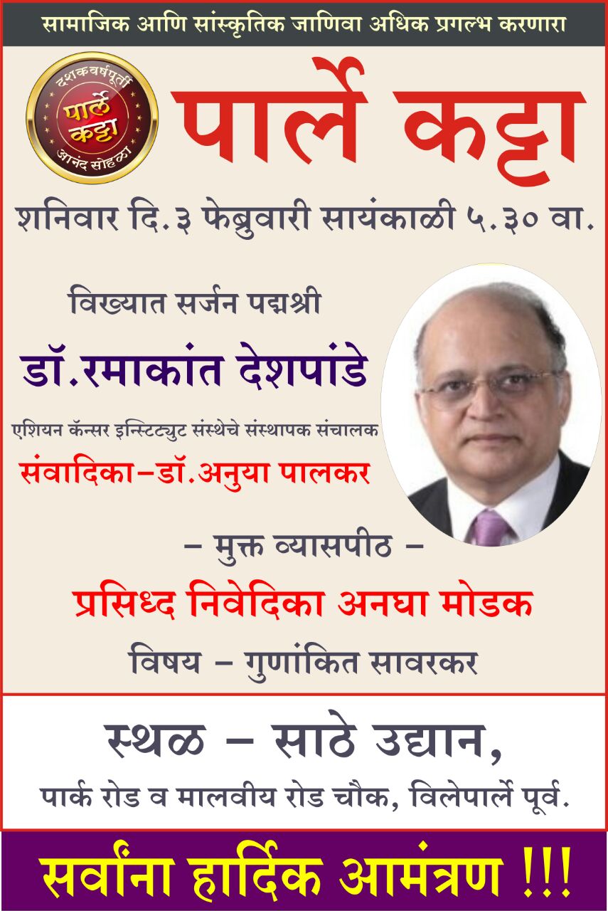 दिनांक ३ फेब्रुवारी २०१८ रोजी होणाऱ्या पार्ले कट्टा या कार्यक्रमात यावेळी पद्मश्री पुरस्कार प्राप्त विख्यात सर्जन डॉ. रमाकांत देशपांडे यांची मुलाखत होणार आहे. डॉ. देशपांडे हे एशियन कँसर इन्स्टिट्यूट चे संस्थापक व संचालक आहेत. डॉ. अनुया पालकर यावेळी डॉ. देशपांडे यांच्याशी संवाद साधतील. या निमित्ताने कर्करोगाविषयी माहिती मिळवण्याची संधी श्रोत्यांना मिळणार आहे.