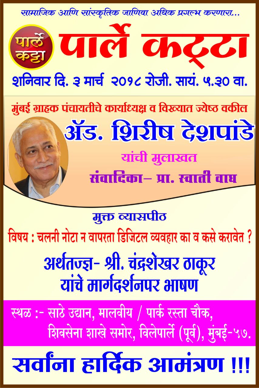 शनिवार दिनांक ३ मार्च २०१८ रोजी सायंकाळी ५. ३० वाजता पार्ले कट्ट्यामध्ये मुंबई ग्राहक पंचायतीचे कार्याध्यक्ष व विख्यात वकील advocate शिरीष देशपांडे यांची प्रकट मुलाखत घेतील प्रा. स्वाती वाघ.