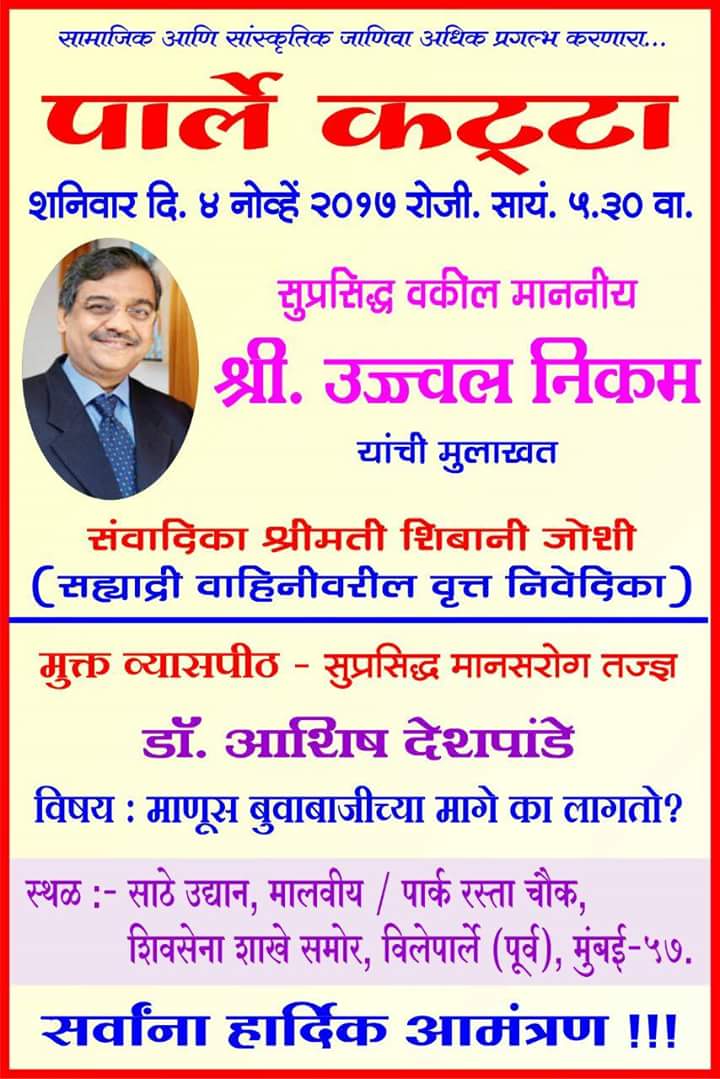 1993, 2003, 2008 चे मुंबईवरील दहशतवादी हल्ले, खैरलांजी हत्याकांड, गुलशन कुमार, प्रमोद महाजन खूनखटला अशा अनेक बहुचर्चित आणि अतिमहत्त्वाच्या केसेसमध्ये सरकारी वकील या नात्याने समर्थपणे जबाबदारी पेललेल्या व्यक्तिकडून त्याचे अनुभव, विचार प्रत्यक्ष ऐकण्याची संधी पार्लेकरांना चालून आली आहे, त्याचा आपण अवश्य लाभ घ्यावा.