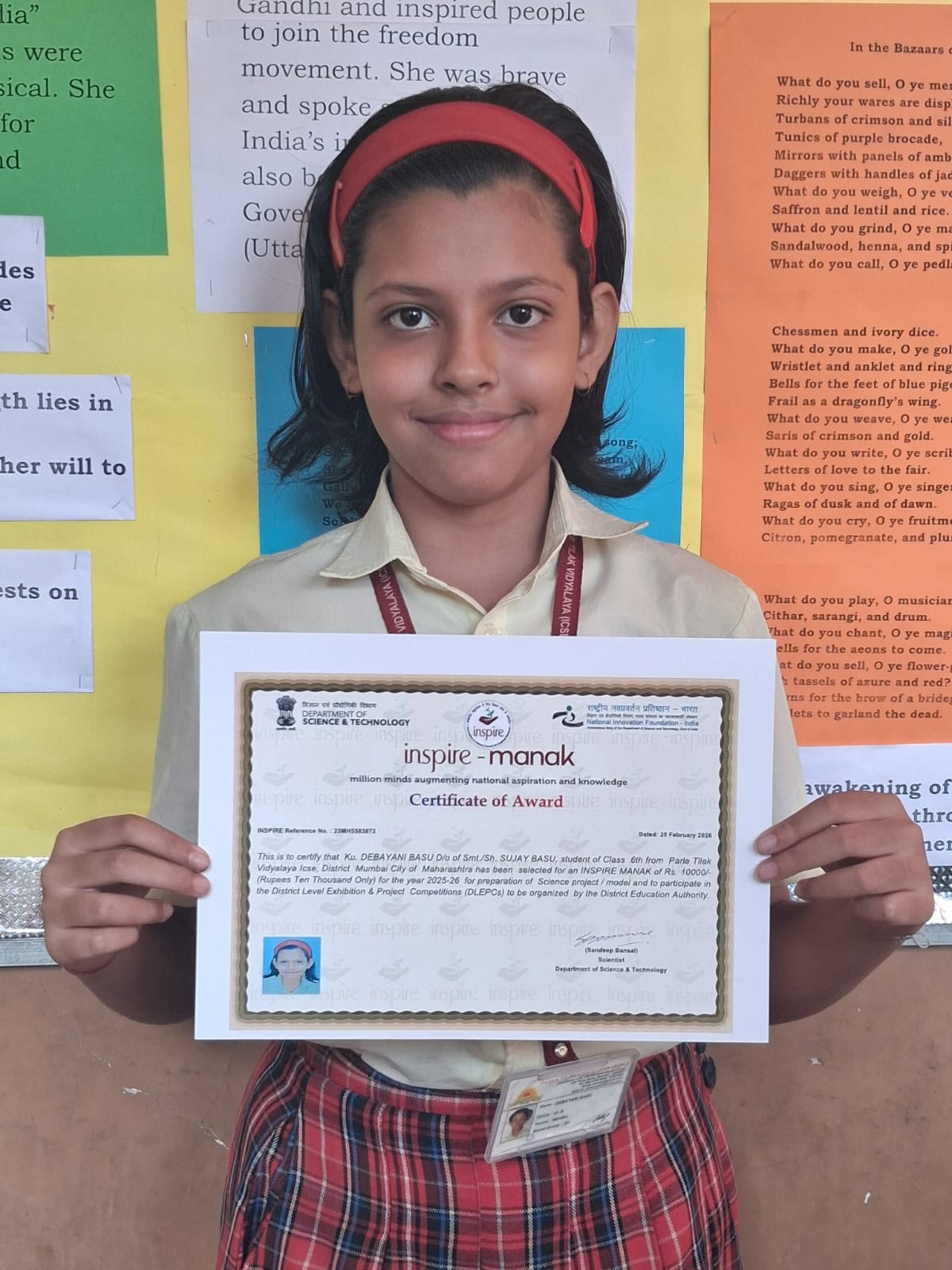 Parle Tilak Vidyalaya (ICSE) has added another feather to its cap as Ms. Debayani Basu, a student of Std. 6D, has been selected for the prestigious INSPIRE–MANAK Award Scheme, an initiative by the Government of India.