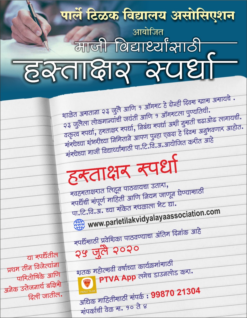 पार्ले टिळक विद्यालय असोसिएशनच्या माजी विद्यार्थ्यांसाठी PTVA आयोजित हस्ताक्षर स्पर्धा