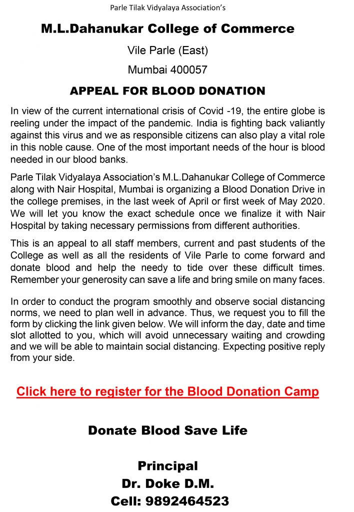 PTVA’s M L Dahanukar College – Appeal for Blood Donation
