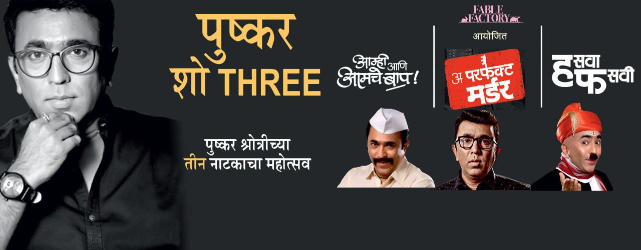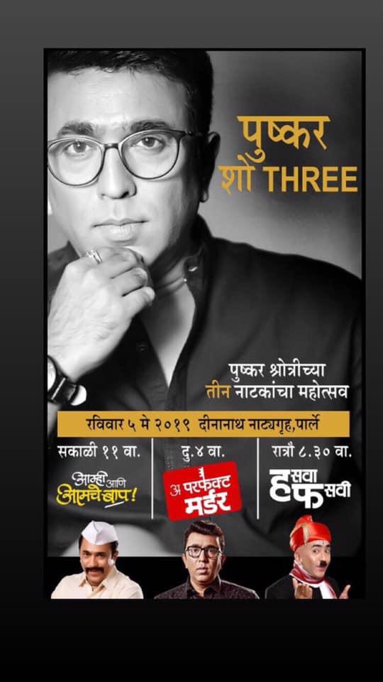 On Sunday 5th May at Dinanath Natya Gruha , Vile Parle east , Pushkar will be performing 3 of his acclaimed plays ” Aahmi ani Aamche Baap” (11 am), “A Perfect Murder” ( 4 pm) and “Hasva Fasvi ” ( 8 pm) , back to back , on the same day.