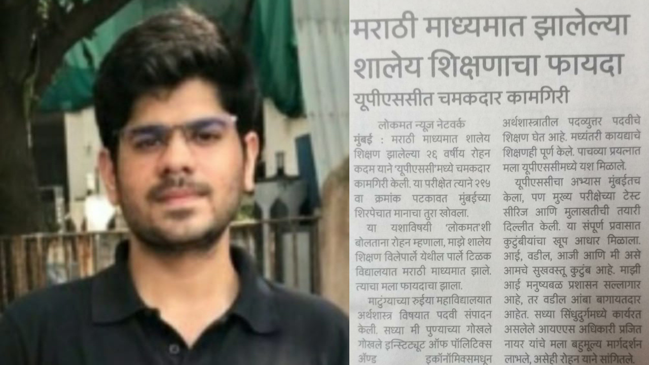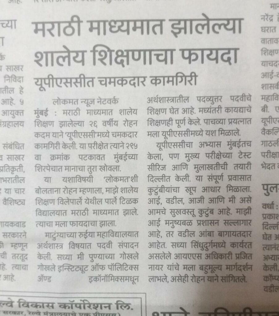पार्ले टिळक विद्यालयाच्या २०११ बॅचचा विद्यार्थी रोहन कदम याची UPSC या परीक्षेत २९५ वा क्रमांक मिळवून दमदार कामगिरी
