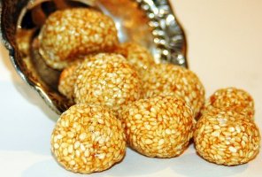 कृती – तीळ चांगले भाजून घ्यावेत.(तीळ खमंग भाजलेत की नाही हे ओळखण्यासाठी भाजलेले तीळ दातांखाली चावले की टचकन आवाज येतो.तीळ भाजल्यावर थोड़े फुगीर होतात आणि त्यांचा रंगही बदलतो.) जर तीळ नीट भाजले नाहीत तर लाडवांला खमंगपणा येत नाही.)शेंगदाणे सुद्धा खमंग भाजून त्यांची साले काढून कुटून घ्यावेत.सुके खोबरे किसून घ्यावे.दाणे,डाळं आणि खोबऱ्याचा किस भाजलेल्या तिळात मिक्स करावा..एक भांड्यात गूळ घालून गरम करावा.गूळ पातळ होउन त्याला बुडबुडे यायला लागले की पाक तयार होतोय असे समजावे.सतत ढवळत रहावे.गैस मध्यम ठेवावा. एका वाटीत थोड़े पाणी घेउन त्यात टाकून बघावा.गुळाची गोळी बनवून पाण्यात टाकली आणि टचकन आवाज आला तर पाक नीट  झाला असे समजावे.मग त्यात तिळाचे मिश्रण घालावे.ढवळून गैस बंद करावा.२ मिनिटानी मिश्रण एक परातीत किंवा ताटात काढून घ्यावे.हाताला तूप लावावे आणि थोड़े थोड़े मिश्रण हातावर घेउन लाडू वळावेत.