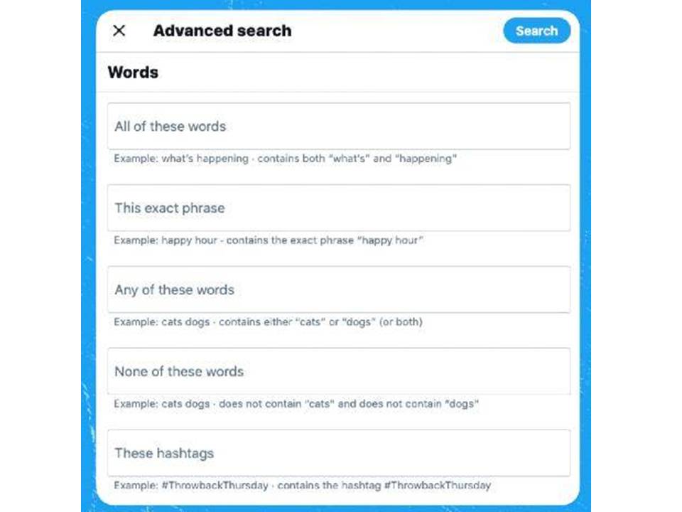 -Under advanced search, users can filter for words, including exact phrases, hashtags, language.