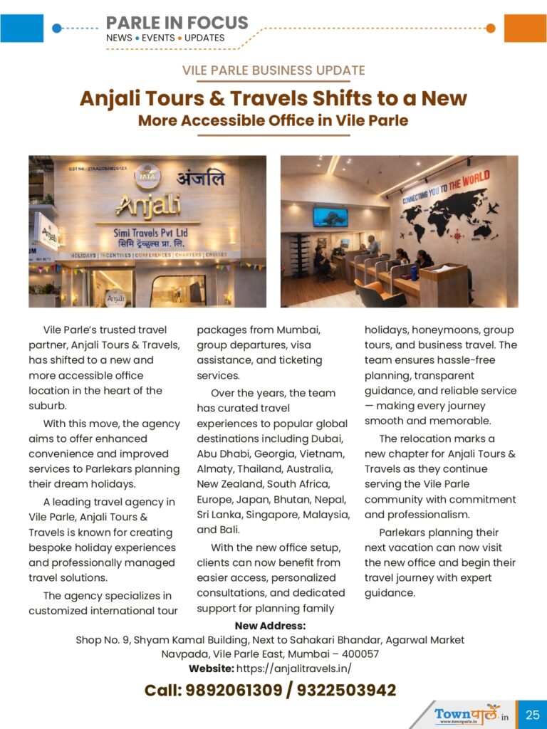 Vile Parle’s trusted travel partner, Anjali Tours & Travels, has shifted to a new and more accessible office location in the heart of the suburb. With this move, the agency aims to offer enhanced convenience and improved services to Parlekars planning their dream holidays.